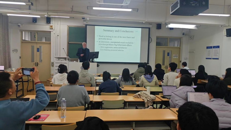 2025年10月24日14:00,积极心理学工作坊第二场在教二312开展。本次主题为“归属感的需求以及社会排斥如何影响人们”。Baumeister教授首先进行实验程序介绍,包括他人是否愿意与一个人合作的选择、基于性格测试结果、让实验参与者回忆被拒经历等,采取的是随机分组以确保实验设计的科学性。接着阐述实验参与者在遭受社会排斥后的行为变化,例如变得更具攻击性,积极行为减少。随后进行自我调节原因探讨、情绪反应分析、疼痛与拒斥关系分析、药物影响研究,最后结论是:社会排斥对个体有广泛负面影响。提问环节,学生和教授讨论了社交恐惧问题以及儿童情绪如何测量。