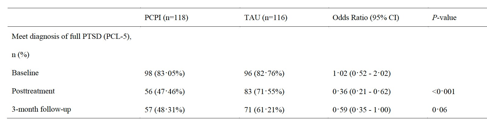 2019-2020年期间,本研究在河南省6所小学的234名受创伤影响的儿童中开展了随机对照试验。经过随机分组后,118名干预组儿童接受了由非专业人员提供的为期2个月的PCPI小组干预,116名对照组儿童接受了由心理教师提供的常规干预。两组儿童在基线、后测及干预后3个月完成了主要结果变量(PTSD)和次要结果变量(抑郁、广泛性焦虑)的评估。基线时,干预组和对照组儿童在人口统计学、临床心理学特征方面均没有显著差异。