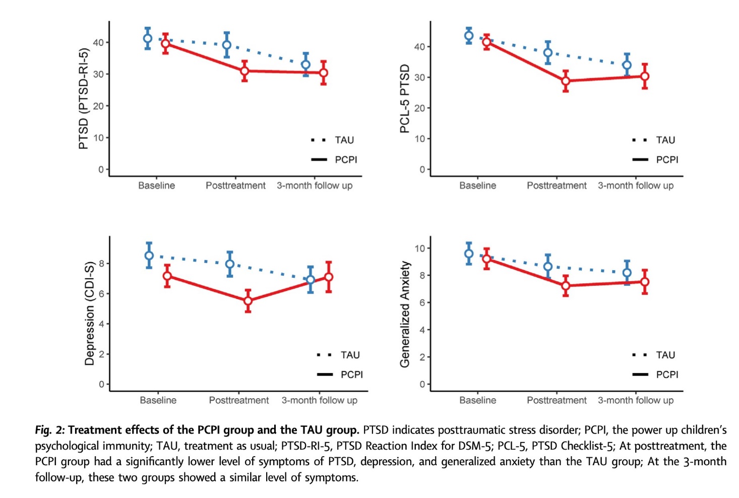 (1)PCPI小组干预能够显著降低我国儿童PTSD、抑郁和广泛性焦虑的严重性