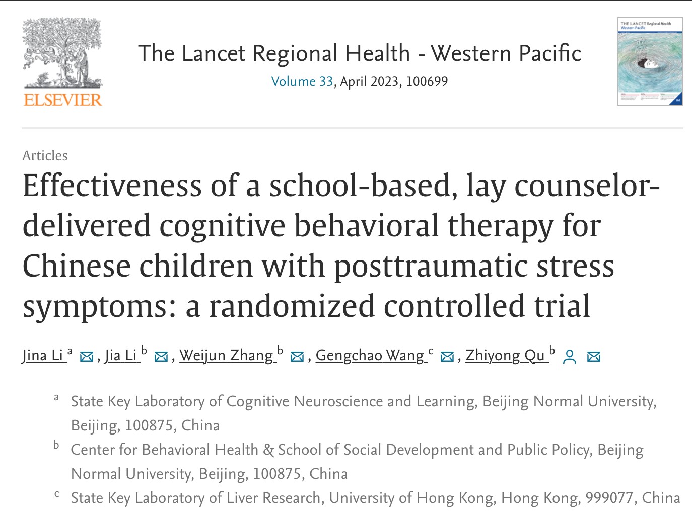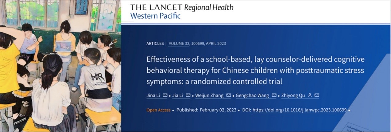 该项研究成果于2023年2月2日被《柳叶刀-区域健康(西太平洋)》(The Lancet Regional Health-Western Pacific)在线发表,题为《Effectiveness of a school-based, lay counselor-delivered cognitive behavioral therapy for Chinese children with posttraumatic stress symptoms: a randomized controlled trial》(基于学校的、由非专科人员提供的认知行为疗法对我国儿童创伤后应激症状的有效性:一项随机对照试验)。该论文第一作者为李继娜,其硕士就读于北师大社会工作专业,博士就读于北师大公共管理专业,现为认知神经科学与学习国家重点实验室博士后,通讯作者为北师大教师屈智勇。