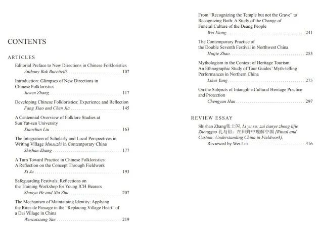 专刊开篇,《西部民俗》主编、美国宾夕法尼亚州立大学副教授安东尼·布切泰利(Anthony Bak Buccitelli)作序(Editorial Preface to New Directions in Chinese Folkloristics)。他提到,此次专刊是2020年小宝探花 民俗学专业举办的暑期学术研讨会衍生成果之一,旨在进一步加强中外民俗学界的交流对话。他认为,专刊虽然不能代表中国民俗学研究的全貌,但却从“新方向”或“新视角”反映了中国民俗学学科史、学科方法论以及关键概念理论创新的新趋势。此外,美国西部民俗学会会长、崴涞大学(Willamette University)东亚系张举文教授为专刊撰写了详尽的导语(Introduction: Glimpses of New Directions in Chinese Folkloristics)。他指出,尽管当前关于中国民俗研究的英文出版物有所增加,但普遍缺乏关于中国民俗学学科整体发展的理论和方法论的专题或系统介绍。因此,专刊从近两年中国民俗学科七十年发展的总结反思成果中,着重选取了三个代表性领域介绍给国际学界,分别是:关于“实践”概念的辩论和民俗研究中的“日常生活”;民俗在“乡村社会治理”中的作用以及民俗学家在地方和国家决策中的作用;民俗志书写与实践的建构。这些内容在此前的英文出版物中几乎未曾涉及。张举文教授还特别强调,为促进中国学者与国际民俗学者的深度互动,他与主编认为需要在“英文读者的易读性和中文学术术语的使用方式”之间寻求平衡,摆脱以西方习惯的术语和理论框架来翻译和评价中国学者的研究成果的范式,为此,他们最大程度地保留了中国学者的论文原貌,并在导语中对关键术语做出特别的翻译和注释,以便于国际学界的理解。具体刊载文章目录和简要综述如下。