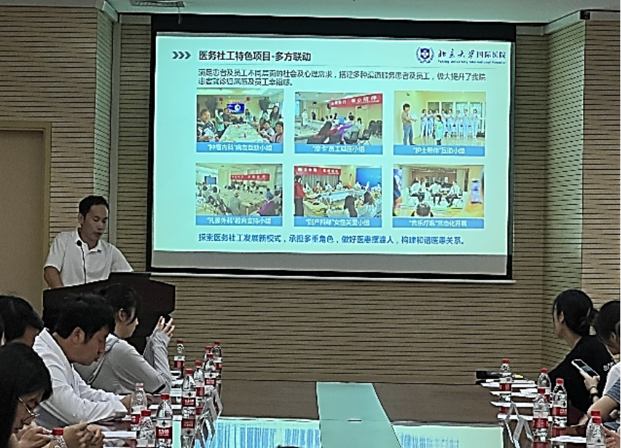 在北大国际医院,小宝探花 赵炜、王珂老师带队,营员们徜徉在宽阔开放的医院门诊大厅,了解到北大国际医院的建设背景与特色建筑功能,聆听到医院党委书记和社工部负责人详细讲解院内医务社工业务的特色与发展前沿,并共同探讨了医务社工一线工作的重点与难点,双方在座谈中均表达了今后全面加强合作的愿景。
